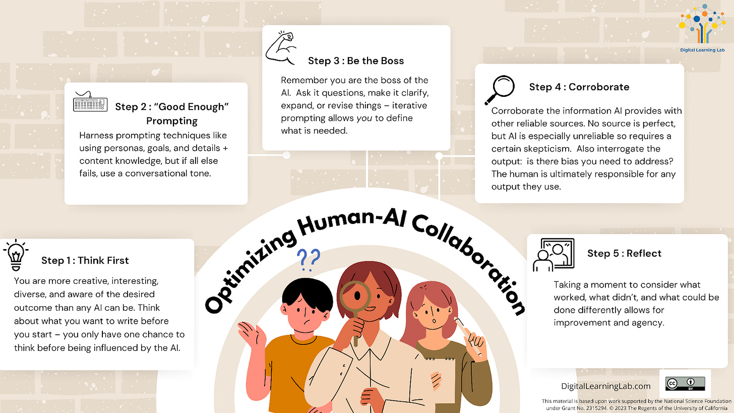 In our NSF-funded research we are finding that the most productive, learning supportive use of generative AI involves a process (see figure below) where students are encouraged to think first before turning to the AI, then after prompting they continue to iterate and “be the boss” of the AI, providing clarifying instructions until the student is satisfied with the generated output (Tate et al., 2025). While we have not checked the brain waves of students, our instructors and students agree that this process leads to more student learning than if they had simply engaged in a transactional prompt and then taken the AI output without additional engagement. This seems in line with the Kos’myna paper and leads to one of our most consistent findings: How you use the generative AI matters. Of course transactional off loading leads to less learning; we know learning requires some productive struggle. As Mollick writes, “we have increasing evidence that, when used with teacher guidance and good prompting based on sound pedagogical principles, AI can greatly improve learning outcomes.” So rather than reading this article as the death knell of generative AI in education, consider it a reminder that implementation matters and that teachers are essential to guiding the process of learning.